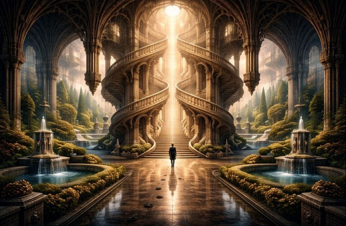 En los jardines barrocos, esta reversibilidad se hace aún más explícita. El eje central, la simetría estricta y la repetición de motivos permiten que el espacio se comprenda desde cualquiera de sus extremos. No hay un comienzo privilegiado: avanzar o retroceder activa las mismas relaciones proporcionales. El recorrido no narra un progreso, sino un equilibrio.